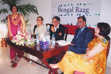 From left: Durdana Soomro, Niaz Zaman, Mr Imran Aslam, President Geo Television, Mr M. Hannan, Deputy High Commissioner of Bangladesh, and Ghazala Hameed at Bengal Raag book launch at Karachi .