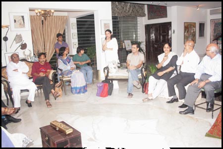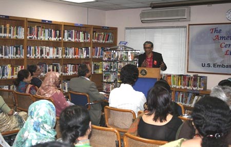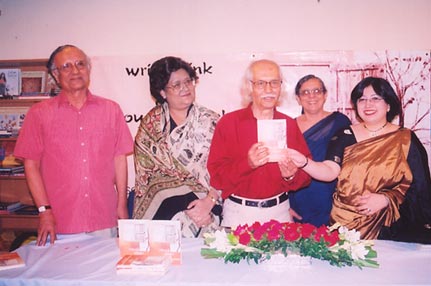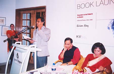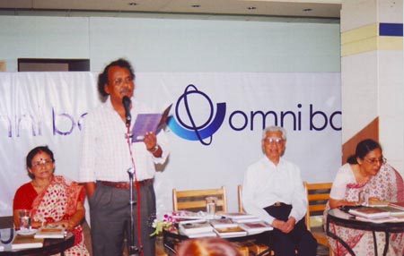 Syed Badrul Ahsan reading from Syed Najmuddin Hashim's Hopefully the Pomegranate. Others in the picture are Mrs Hashim, Jharna Rahman, and Niaz Zaman.