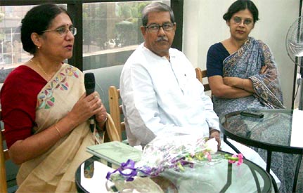 Purabi Basu speaking at the launch of Radha Will Not Cook Today on July 17, 2007. Others in the picture are Professor Anisuzzaman and Dr Nuzhat Amin.