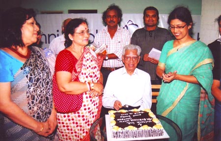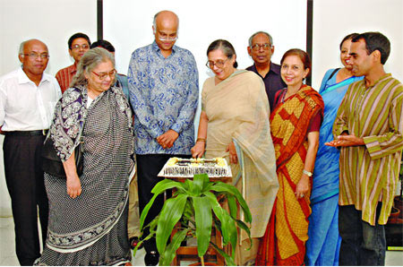 Abul Hussain cutting the cake. Others in the picture are, from left, Shahruk Rahman, Jharna Das Purkayastha, Khondakar Ashraf Hossain, Minhazul Anwar Mridul, and Jharna Rahman.