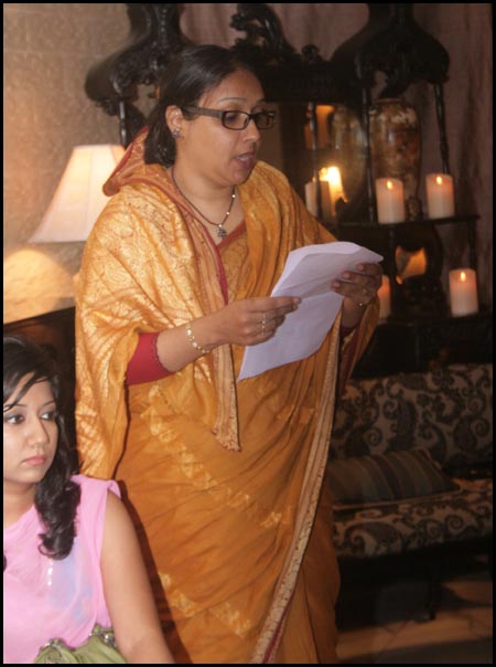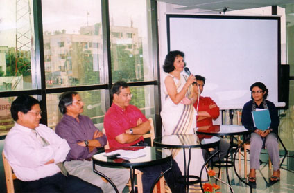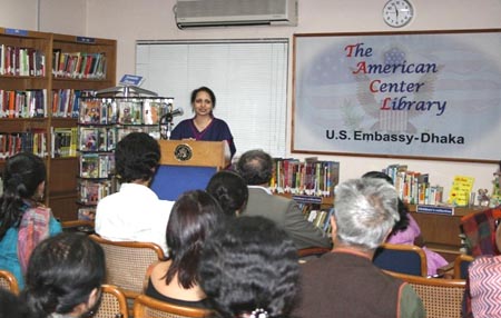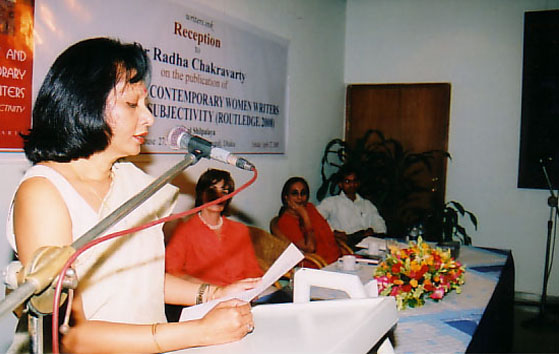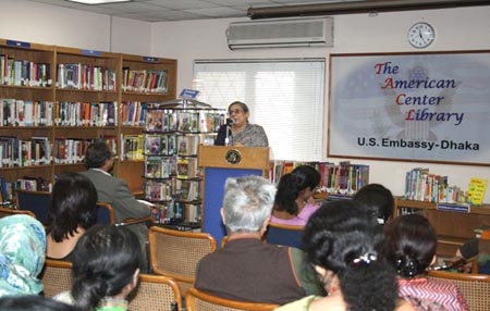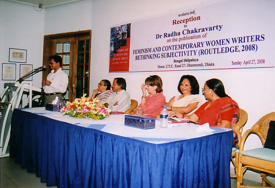 Dr. Radha Chakravarty speaking at the writers.ink and omni books reception to Professor Fakrul Alam on the publication of South Asian writers in English. Other in the picture are Mr. Ali Ahmed, Professor Syed Manzoorul Islam Professor Kaiser Haq and Ms.Rubana Huq.
