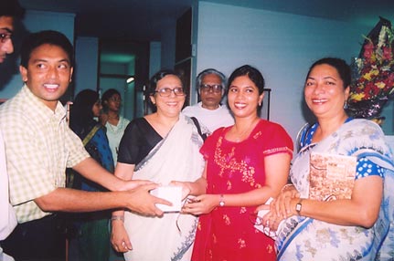 Mrs Hashim giving a copy of Syed Najmuddin Hashim's Hopefully the Pomegranate to Abul Hussain. Khondakar Ashraf Hossain is on the left of the picture.