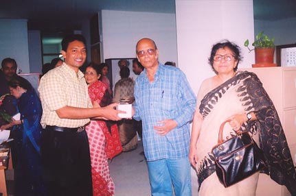 Prof. Niaz Zaman receives a copy of Kalhar from Prof. Zillur Rahman Siddiqui; Dr. Enamul Haque seen on the right.